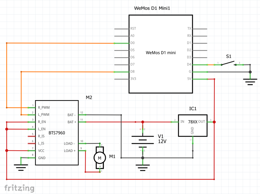 Introduksjon Denne guiden gir ikke alle detaljer, men prøver å gi generelle retningslinjer som kan forenkle prosessen ved å bygge noe tilsvarende. Verktøy Kapp-/Gjærsag Drill 35mm bor (sylinderbor/ hengselbor) https://www.biltema.no/verktoy/bor/trebor/sylinderbor-2000016848 https://www.byggmakker.no/produkt/hengselbor-35mm-8x60-2-skjaer/7311662131784 “Tapetkniv” Mal for hullboring (skrog/dør) Hurtigtvinge Linjal/vinkel (stål/alu for kutting av sokkellist) Vinkelsliper 3d printer Deleliste Aktuator (150mm, 90mm/s) https://www.aliexpress.com/item/4000849922418.html?spm=a2g0o.order_list.order_list_main.14.21ef1802NtTDy9 Motorstyring https://www.aliexpress.com/item/4000002701244.html?spm=a2g0o.order_list.order_list_main.19.21ef1802NtTDy9 Hengsler (uten demping) https://www.clasohlson.com/no/p/40-7887 Monteringsbånd https://www.biltema.no/bygg/byggbeslag/hullband/monteringsband-galvanisert-2000017277 Limit switch https://artigereliv.no/produkt/elektronikk/mikrokontrollere/sensorer-og-tilbehor/3d-printer-limit-switch D1 mini (esp8266) Stepdown https://www.aliexpress.com/item/1005003140077648.html?spm=a2g0o.productlist.main.1.598b2b06DMKN7g&algo_pvid=3f583756-e566-460d-a392-336417dbe220&algo_exp_id=3f583756-e566-460d-a392-336417dbe220-0&pdp_npi=4%40dis%21USD%211.59%211.59%21%21%211.59%21%21%402103135816942659190861478edc71%2112000024308653563%21sea%21NO%21182151077%21S&curPageLogUid=J0TC7f4ZOn7G Strømforsyning https://www.aliexpress.com/item/32805093211.html?spm=a2g0o.order_list.order_list_main.129.24311802Qmk128 Passe lang M6 bolt til å feste aktuator (2stk) M6 Skiver M6 låsemutter Ståltråd https://www.biltema.no/fritid/hage/gjerde/staltrader/staltrad-50-m-2000041228 Div ledninger Små skruer til å feste aktuatorbrakett i dør Bygge rammen Mockup av rammen. Jeg bygget rammen min av terrassebord jeg hadde liggende (28x120), men akkurat hva det er så lenge det passer underkjøkkenbenken er ikke så viktig. Bredden innvendig bør være støvsuger + rundt 3cm klaring på hver side av den innvendig (husk bredde på aktuator og klaring fra denne mot ramme kan være rundt 4cm). Dybden på rammen kan være noe kortere enn totaldybde, da det kan justeres med overliggeren som døra festes i. Rundt 5mm kan være greit, men dette må vurderes individuelt. Senterpunkt i rammen vil da være mellom den ene siden, og mot aktuator på andre siden. Jeg kuttet også hull i bakkant til docking, for å få litt ekstra dybde. Jeg boret også hull til en guide-pinne som sitter i veggen (type treplugg som kommer med flatpakkede skap o.l.). Dette for å ha et fast punkt å jobbe fra (måtte ha rammen ut flere ganger for å måle). Toppen av overliggeren bør være så nært undersiden av benk som mulig, for at dør ikke skal komme i konflikt med rammen under åpning. Jeg endte opp med å shimme den opp fra rammen, for å redusere avstanden mest mulig. Hengsler Bor hull til hengsle ved bruk av mal i dør og overligger (holdes fast med hurtigtvinge). Modifiser hengsle ved å ta bort fjær, slik at den glir uten motstand. Bor ut aksling den er festet på ihht bilde. Aktuator Aktuator festes med noe klaring mot gulv, horisontalt fra dør til ramme. Klaring mellom dør og ramme er avstanden til hengsle, og må tas med i beregningen når overligger monteres mtp dybde under benk. Rundt 4-5mm opp fra gulvet burde være en god plassering. Forsenket M6 bolt med skive fra utside, slik at envelopen ikke er større enn rammen. Bolten er så festet med skive og låsemutter på innsiden, og så shimmet ut til riktig avstand for montering av aktuator. Brakett med M6 bolt, merk ingen mutter. Dette er for mekanisk override, ved at sokkel ved siden av ramme kan tas av, og bold fjernes ved funksjonssvikt. Legg merke til avrundet hjørne i bakgrunn for tilgang til bolt fra utsiden. Bolt er kuttet i lengden, slik at den skal være enklest mulig å få ut. Kutte sokkellist For å kutte sokkellisten lagde jeg først et dypt kutt med en tapetkniv på fronten (bruk linjal/vinkel med hurtigtvinge for å unngå feilskjær), deretter brukt jeg en gjærsag med dybdestopp for å kutte resten fra baksiden. Dette sørger for kutte bort minst mulig materiale, for best mulig sammenstilling. Kode // constants won't change. They're used here to set pin numbers: const int pushPin = 2; // D4 -> switch, motor const int overRidePin = 14; // D5 -> switch, override const int openPin = 16; // D0 -> 3, BTS7960 const int shutPin = 15; // D8 -> 4, BTS7960 // Variables will change: int openState = LOW; // int shutState = HIGH; // int pushState; // the current reading from the input pin int lastPushState = LOW; // the previous reading from the input pin // the following variables are unsigned longs because the time, measured in // milliseconds, will quickly become a bigger number than can be stored in an int. unsigned long lastDebounceTime = 0; // the last time the output pin was toggled unsigned long debounceDelay = 100; // (50) the debounce time; increase if the output flickers void setup() { Serial.begin(115200); Serial.println("setup"); pinMode(pushPin, INPUT); pinMode(overRidePin, INPUT); pinMode(openPin, OUTPUT); pinMode(shutPin, OUTPUT); // set initial state digitalWrite(openPin, openState); digitalWrite(shutPin, shutState); } void loop() { // read the state of the switch into a local variable: int reading = digitalRead(pushPin); // check to see if you just pressed the button // (i.e. the input went from LOW to HIGH), and you've waited long enough // since the last press to ignore any noise: // If the switch changed, due to noise or pressing: if (reading != lastPushState) { // reset the debouncing timer lastDebounceTime = millis(); } if ((millis() - lastDebounceTime) > debounceDelay) { // whatever the reading is at, it's been there for longer than the debounce // delay, so take it as the actual current state: // if the button state has changed: if (reading != pushState) { pushState = reading; // only toggle the door if the new button state 