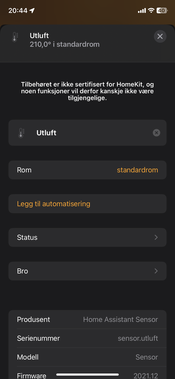 Hei alle sammen, eg har et oppsett for å lese ut en del verdier via modbus på mitt Villavent / Systemair VTR150. Det er tilkoblet via en modbus-til-ethernet converter. I min konfigurasjon har eg følgende innlesing: modbus: - name: vtr150 type: tcp host: 10.160.1.98 port: 8234 timeout: 3 delay: 5 close_comm_on_error: false retry_on_empty: true retries: 10 sensors: - name: Utetemperatur unit_of_measurement: °C scale: 0.1 precision: 1 scan_interval: 10 slave: 1 address: 12101 data_type: int device_class: temperature - name: Tilførselsluft unit_of_measurement: °C scale: 0.1 precision: 1 scan_interval: 10 slave: 1 address: 12102 data_type: int device_class: temperature - name: Utluft unit_of_measurement: °C precision: 1 scan_interval: 10 slave: 1 address: 12543 data_type: int device_class: temperature - name: Luftfuktighet unit_of_measurement: "%" scale: 1 precision: 1 scan_interval: 10 slave: 1 address: 12135 data_type: int device_class: humidity - name: RH-sensor unit_of_measurement: "%" scale: 1 precision: 1 scan_interval: 10 slave: 1 address: 1000 data_type: int device_class: humidity - name: Viftemodus slave: 1 address: 1130 precision: 0 count: 1 data_type: uint Mitt problem er at verdien "Utluft" blir vist som 210 grader C når den skulle vere 21 grader C. Altså en type konverteringsfeil. Korleis kan eg få endra dette i konfigurasjonen eller før dataene sendes til via Homebridge til IOS?