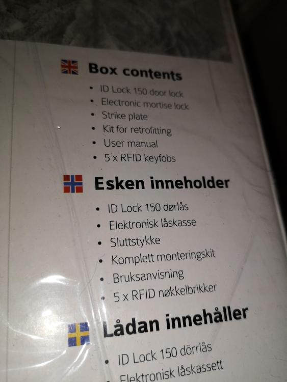 Har en helt ny ID Lock 150 til overs etter et lite smart hjem prosjekt. Veldig enkel å montere. Info om produktet : Elektronisk dørlås for ettermontering som via RFID-brikker eller portkode kan låse eller åpne døren uten nøkkel. Kan utvides med Z-wave-modul (50996) for å kunne kobles til en Z-wave-kompatibel kontroller. Selve låshuset og utsiden tåler ekstremvær og driftstemperaturer på -40 – 85 °C takket være IP55-klassifisering. Låsen kan også gi gjester midlertidig adgang med midlertidige koder som gjelder i et tidsrom eller et bestemt antall ganger. Maks. antall koder: 9 stk. Maks. antall ID-brikker: 9 stk. Drives av fire eller åtte AA-batterier (følger ikke med). Batteritid: opptil 1 år (opptil 10 måneder med Z-wave-modul). Backup-batteri: 9 V (følger ikke med). Varsler ved lavt batterinivå. Leveres med låshus, komplett monteringskit, sluttstykke og fem RFID-brikker. SSF 3522 klasse 3 sertifisert. Disse koster fra 4390 litt avhengig av hvor du kjøper de fra. Tenkte 3600 eller best offer. Helst hentes i Lillestrøm men kan sende med norgespakke mot kostnad.