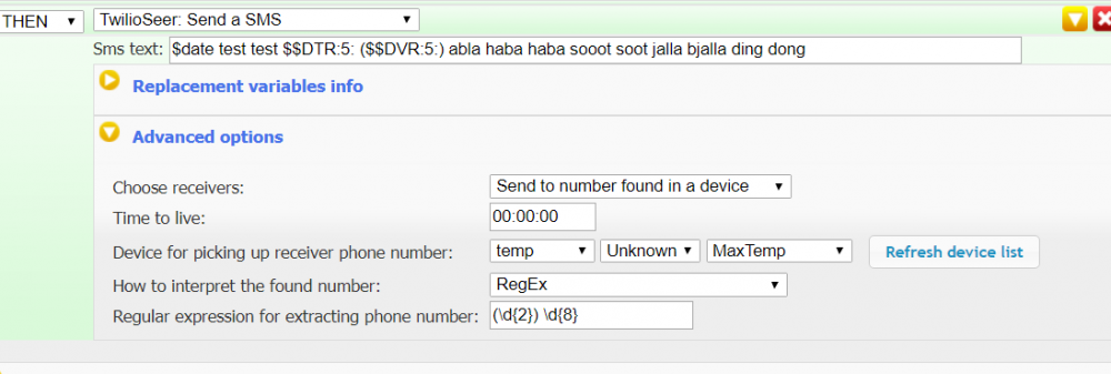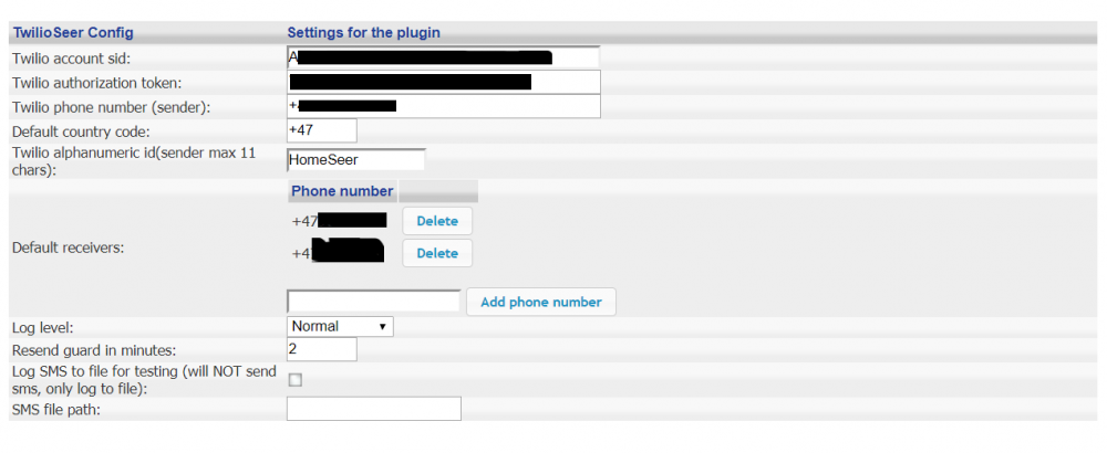 Dette er en plugin for å kunne sende sms ved hjelp av BulkSMS, Twilio eller BudgetSMS. https://www.bulksms.com/ https://www.budgetsms.net/ https://www.twilio.com/ Link til nedlastning HSPI_TwilioSeer_V_1.2.1.2 Personlig så anbefaler jeg ikke Twilio mer. BudgetSMS er billigst, men litt mer klønete betaling (betale via bank eller bitcoin). Det står at de støtter PayPal, men jeg har ikke skjønt hvordan man får gjort dette. I event 2019-04-27: Nå også med muligheten til å hente inn telefonnummeret som det skal mottas fra i teksten på en annen enhet (device). Man kan plukke enhet. Velge om man skal ta teksten som As Is - som den er PlanyoFormat - eget format (47) 12345678 RegEx - Regulært uttrykk Config Nytt fra 2019-04-27 er at man kan velge å legge inn alphanumeric id som avsender. Man kan f.eks. ha HomeSeer som avsender. Krav til alphanumeric id: Max 11 tegn. Kun A-Z, a-z, 1-9 og <space>. Man kan ikke ha kun tall for å spoofe andre nummer Resend guard - beskytter deg mot å sende samme melding mer enn en gang over gitt periode. Her har jeg selv satt den til 2 minutter. Så hvis det kommer en eksakt lik melding til samme mottaker og den allerede er sendt for 2 minutter siden eller mindre så sendes ikke ny. Utført: Lagt til BudgetSMS som mulig sender Lagt til BulkSMS som mulig sender Kjente feil: Ved endring av provider/smsselskap i config så går det fort 20-60 sekunder fra du velger en ny provider til tekst etc er oppdatert og du kan begynne å lagre brukerinfo. Videre planer: Lage en ny plugin på grunnlag av TwilioSeer som skal støtte flere leverandører Kunne overstyre default receivers når man legger inn event. Kunne sette en levetid på sms slik at hvis den ikke blir sendt på første forsøk så prøves inntil sms blir sendt eller angitt levetid er over. Jeg er åpen for innspill hvis noen ser noen mangler. 1.2.1.2 - Fikset problem med retry logikk som ikke hang helt på greip. Førte til at meldinger ble hengende uten å bli sendt. 1.2.1.0 - Fikset problemet med at valg av sms leverandør tok lang tid. Fra man valgte i dropdown til det oppdaterte seg tok fort 30 sekunder. 1.2.0.2 - Fjernet noen debug-meldinger (Console.Write) 1.2.0.1 - Fikset feil innhenting av brukernavn ved bruk av BulkSMS