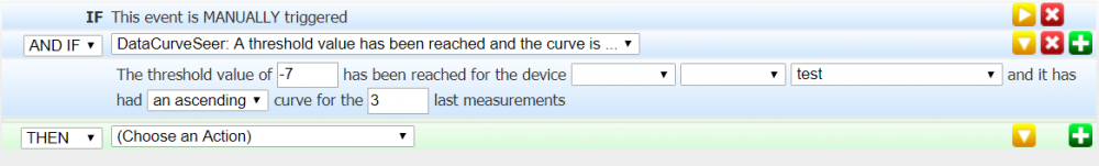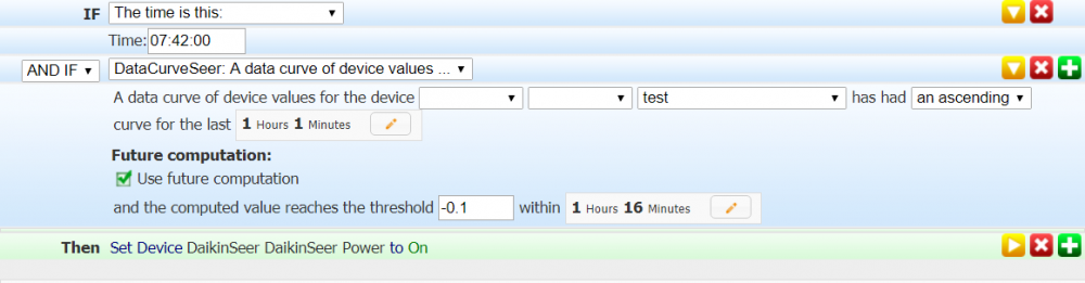 Dette er en enkel plugin som kun brukes som condition i en event. Kun testet i Windows Plugin kan lastes ned her HSPI_DataCurveSeer versjon 0.0.0.4 VIKTIG!!! Stopp Homeseer og ta en kopi av hele katalogen til Homeseer (normalt "c:\program files (x86)\Homeseer HS3" for Windows) og legg kopien på ett trygt sted i tilfelle du trenger å gå tilbake. Pakk ut filen i din Homeseer katalog - pass på at du får følgende oppsett (katalogen "Homeseer HS3" skal inneholde 2 nye filer HSPI_DataCurveSeer.exe og HSPI_DataCurveSeer.exe.config, i katalogen Homeseer HS3\bin skal ha fått en ny underkatalog - DataCurveSeer - med 24 filer og i katalogen html\images skal du ha fått underkatalogen DataCurveSeer med 2 filer) Restart Homeseer Gå inn på Homeseer->Plugins->Manage og trykk enable på DataCurveSeer Plugin gir deg 2 valg når du lager events: Her prøver man ut fra enheten man har satt til å overvåke å predikere om man vil gå over en gitt verdi i løpet av en gitt periode hvis stiging/senkning fortsetter slik det har gjort. Her vil man trigge hvis man har passert gitt grenseverdi og kurven man har er stigende eller synkende Ansvarsfraskrivelse: Laste ned og bruke plugin gjøres på eget ansvar. Skulle jeg ødelegge Homeseer oppsettet ditt så kan jeg desverre ikke hjelpe deg.