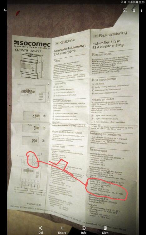 1. B-måler og trådløs pulsteller. Jeg er på jakt etter en frittstående standard enhet/konverter som skal ta imot S0 pulser 0,1 kWh/puls fra b-måler. Fra denne enheten/telleren er det ønskelig med trådløs wifi/z-wave overføring av løpende kWh data til nettbrett/mobil. Vet noen om noe standard produkt(kombinasjon) som kan dette? Vedlagt er bilde av B-måler og utsnitt infoseddel for den. Vh Willy