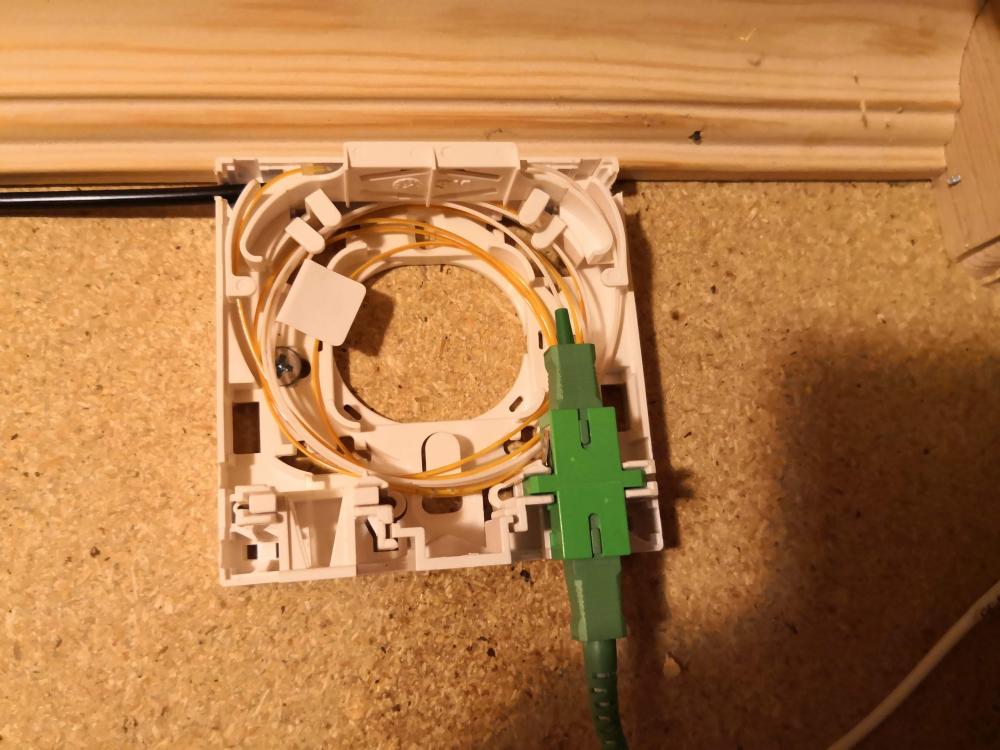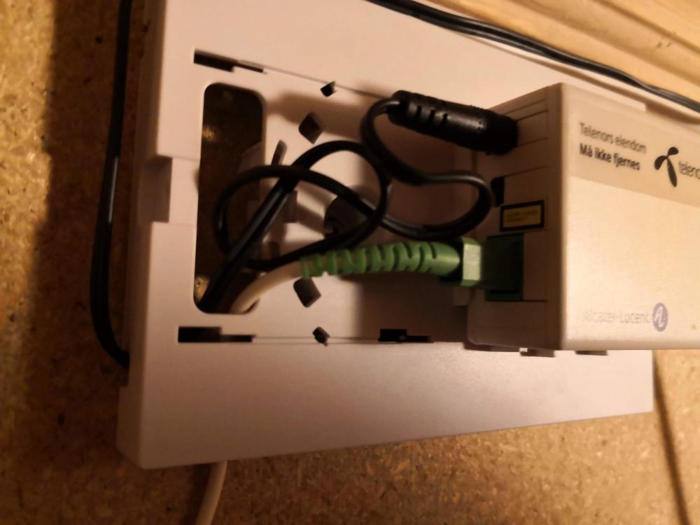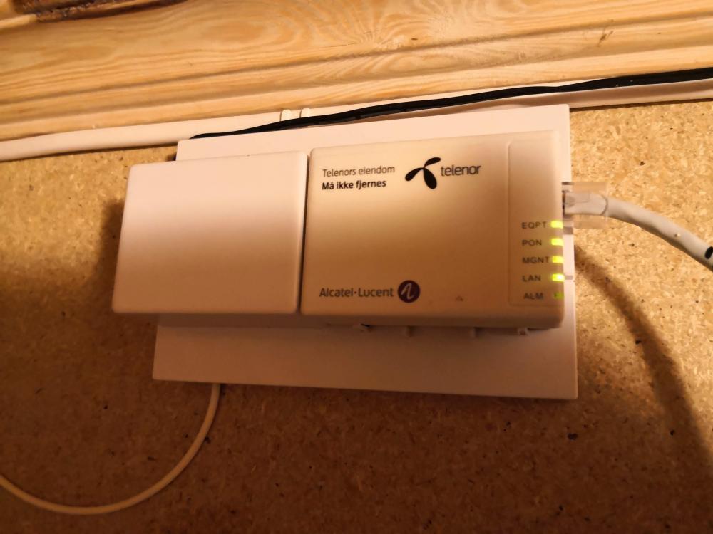 1. Trenger litt hjelp til å få koblet fiber rett i ruter eller switch (hvis det er mulig) Case: Har i dag fiber fra Telenor inn i huset, den går inn i en termineringsboksboks og så en liten fiber patchekabel som går over til en Fiber til kobber konverter (RJ45 uttak) fra Telenor/Alcatel. Mitt ønske er å sløyfe konverteren til Telenor og legge fiber rett inn i enten ruter eller switch. Jeg har per i dag en Mikrotik hAP ac som fungere som ruter (link), denne har en SFP port som jeg tror det burde være mulig å legge fiber inn i. Men kunnskapen min kommer til kort, jeg vet jeg trenger en ekstra modul til ruteren og jeg vet at jeg også trenger en fiber kabel i mellom den og termineringsboksen. Men akkurat hva trenger jeg? Jeg får i løpet av de neste dagene også en HP ProCurve 2910al-24G PoE+ J9146A switch (link). Denne har mini-GBIC porter som jeg har forstått egentlig er det samme som en SFP port, mulig den også kan brukes, men problemet her er vel kanskje igjen at denne switchen ikke har samme funksjonalitet som ruteren (firewall, port-forwarding osv) (igjen jeg er langt ifra noe ekspert på dette med nettverk, men under opplæring) Legger ved noen bilder av termineringsboks til fiber og konverter.