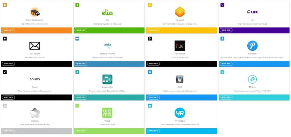Ved å logge seg inn på Telldus kontroller (znetV2) kan man se hvilke plugins som finnes: Blink1: Notifications; Get notified with the blink(1) USB light Eliq: Import Eliq energy data into Telldus Live HomeKit: Connects TellStick to the Apple Home app in iOS Lifx: Plugin that allows you to control Lifx bulbs Mail sender: Send emails from lua scripts Netatmo Weather: Use Netatmo weather station in Telldus Live! Philips Hue: Control Philips Hue lights Pushover: Pushover makes it easy to get real-time notifications on your Android, iPhone, iPad, and Desktop Sonos: Plugin that allows you to control Sonos speakers SqueezeBox: Plugin to control Logitech Squeezebox from TellStick SUS: SUS allows you to send events to a Syslog server. TP-Link: Plugin that allows you to control TP-Link HS100/HS110 Verisure: Plugin to read status from a Verisure Alarm WeMo: Control WEMO Insight YR Weather: Import weatherdata from the current location from yr.no .... For å kunne logge på kontrolleren må man først logge seg inn på sin router og finne IP adressen til Telldus zNet.