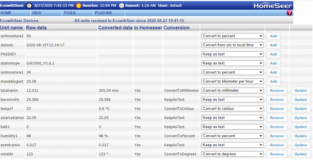 Link til siste versjon HSPI_EcowittSeer_0021 Hvordan sette opp : VIKTIG!!! Stopp Homeseer og ta en kopi av hele katalogen til Homeseer (normalt "c:\program files (x86)\Homeseer HS3" for Windows) og legg kopien på ett trygt sted i tilfelle du trenger å gå tilbake. Pakk ut filen i din Homeseer katalog - pass på at du får følgende oppsett (katalogen "Homeseer HS3" skal inneholde 2 nye filer HSPI_EcowittSeer.exe og HSPI_EcowittSeer.exe.config, mens du i katalogen Homeseer HS3\bin skal ha fått en ny underkatalog - EcowittSeer - (med 19 filer) . I tillegg legger det seg filer i katalogen html/images/EcowittSeer (noen bilder/ikon) og html/EcowittSeer (1 aspx-fil - ecowitt.aspx) Restart Homeseer (mulig det holder å bare gjøre en refresh i Plugins->Manage) Gå inn på Homeseer->Plugins->Manage og trykk enable på EcowittSeer Oppsett Hvordan å sette opp i Ecowitt Last ned WS View fra Google Play Etter å ha konfigurert GW1000 og sensorene gå til Device List. Trykk på stasjonen din. Du skal få opp "Live data". Velg "More" og "Weather Services" Bla deg gjennom ved å trykke "Next" til du kommer til "Customized". Fyll inn detaljer som vist under: "Server IP/Hostname": Erstatt <Your URL/IP to HomeSeer> med din url/ip til HomeSeer "Path": Denne settes til ecowittseer/ecowitt.aspx "Port": Hvis du benytter en annen port enn port 80 må dette settes her Funksjonalitet i HomeSeer General settings Her kan man velge om man vil ha en enhet i HomeSeer som sier noe om sist man mottok data. Hake av denne skaper den. Fjerner man haken så slettes den. "Log lever": Enn så lenge tror jeg kun Debug og None gjør noe. Devices Her velger du hvilke data som du vil ta inn i HomeSeer. Velg ønsket konvertering og så trykk på "Add". Du kan også endre konvertering. Velg ønsket konvertering og trykk på "Update". Ønsker du å fjerne en enhet trykk på "Remove". Den vil da fjernes fra HomeSeer, men du vil fortsatt se den i listen. "Refresh page" laster siden på nytt og viser hvis det er kommet inn nye data. Ansvarsfraskrivelse: Laste ned og bruke plugin gjøres på eget ansvar. Skulle jeg ødelegge Homeseer oppsettet ditt så kan jeg desverre ikke hjelpe deg. Planlagte utvidelser/ønskeliste Mulighet til å se konverteringen etter at man har gjort valget i dropdown. Litt penere tekst på konverteringsvalg Ikoner til de forskjellige typene Mulighet for å gruppere data til grupperte enheter i HomeSeer Mulighet for å ikke skrive til statusfelt + ikke ha ikon slik at folk selv kan bestemme Kjente feil: Endringer: 0.0.2.1 - Fikset oppdatering av connected device 0.0.2.0 - Plugin håndterer nå input fra både 868MHz og 433MHz samtidig. Eventuelt også andre frekvenser. I tillegg fikset forhåndsvisning av konverteringer slik at det vises uten at man trenger å trykke på Add. 0.0.1.0 - Fikset forhåpentligvis på ressursbruk. Cacher nå lokalt i plugin diverse info om benyttede HomeSeer devicer som bør gjøre den raskere og mindre ressurskrevende 0.0.0.8 - Verdi etter konvertering har nå kun 2 desimaler. 0.0.0.7 - Lagt til konverteringen No text som gjør at man selv kan settes statustekst 0.0.0.6 - Konverterer nå grader til kompassretninger 0.0.0.5 - Konvertering til lux. Håndtering av navn med underscore. 0.0.0.4 - Viser nå konvertering ved endring av dropdown uavhengig om man har lagt inn enhet i HomeSeer eller ikke. Litt penere tekst på drop down for konvertering. Lagt på ikon for temperatur og fuktighet. 0.0.0.3 - Man kan nå se hvordan konverteringen ser ut når man endrer valget i drop down. 0.0.0.2 - Håper å ha fikset opp for de som kjører noe annet enn US i regional settings. 0.0.0.1 tok ikke hensyn til dette og da fungerte ikke konverteringen.